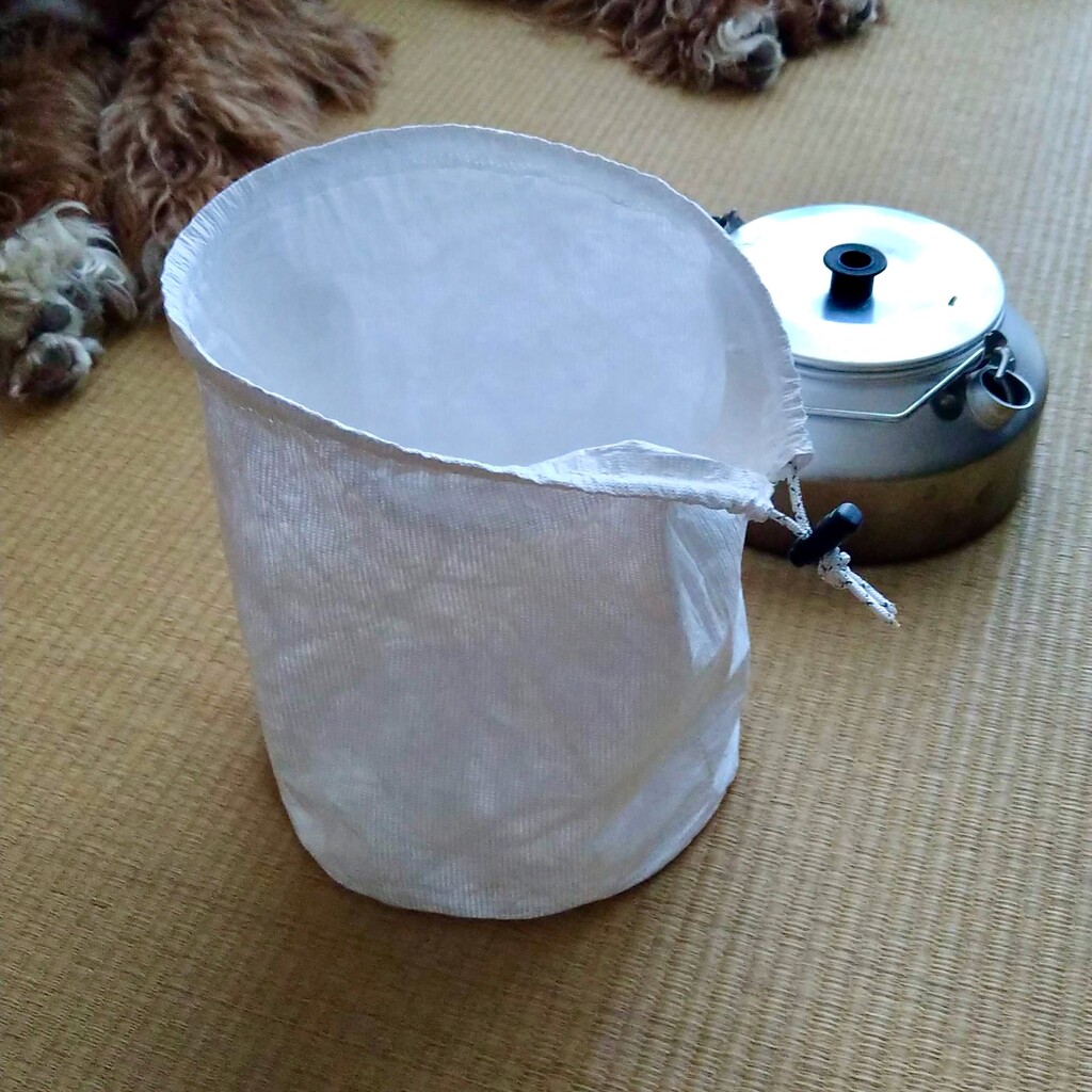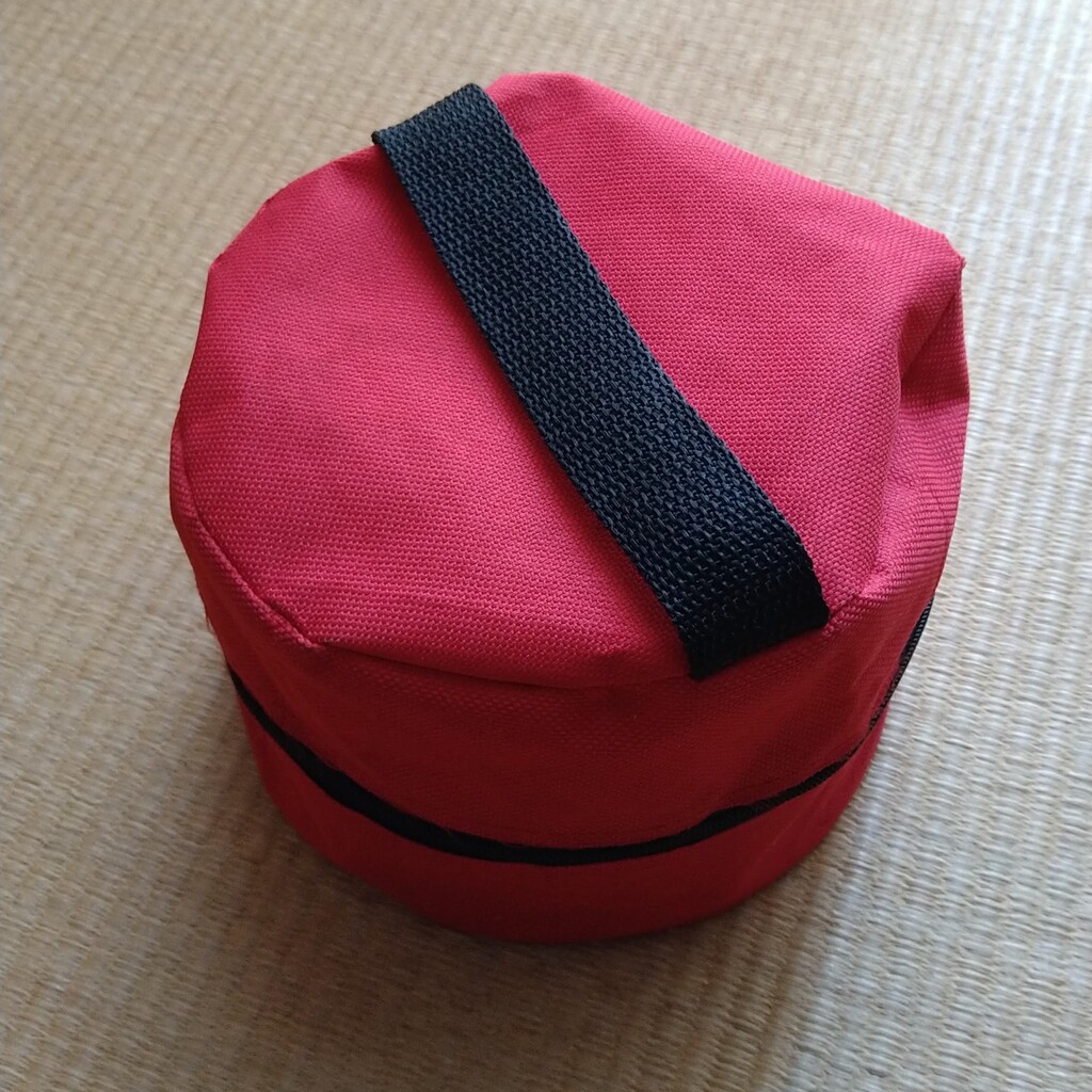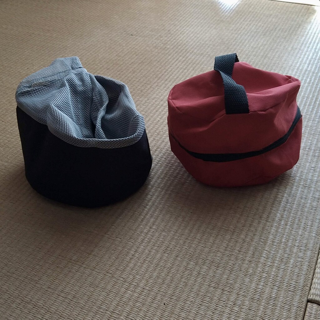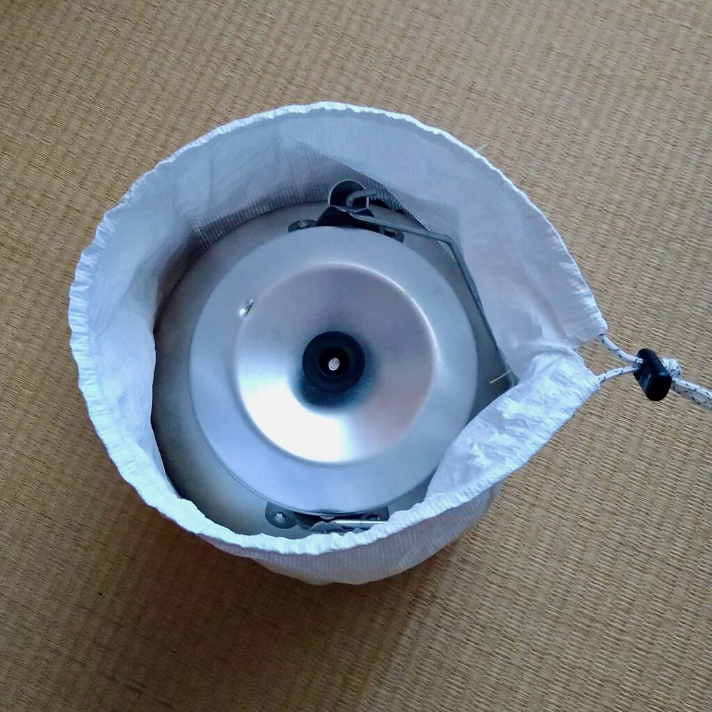 屋外湯沸かしセットを入れるULスタイルの丸底巾着を作ってみた。